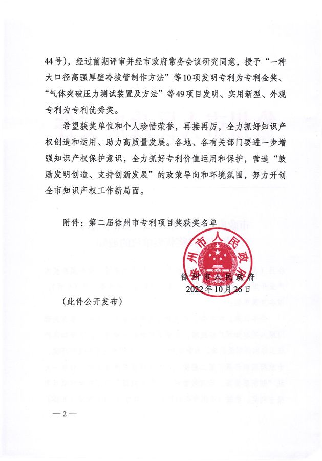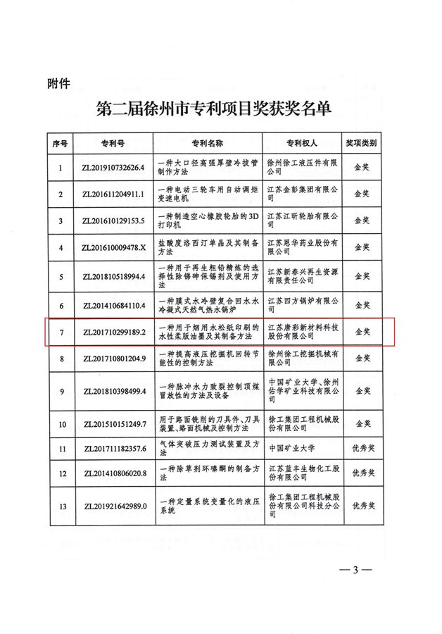 熱烈祝賀我司“一種用于煙用水松紙印刷的水性柔版油墨及其制備方法”被徐州市人民政府評定為“第二屆徐州市專利項目獎”金獎